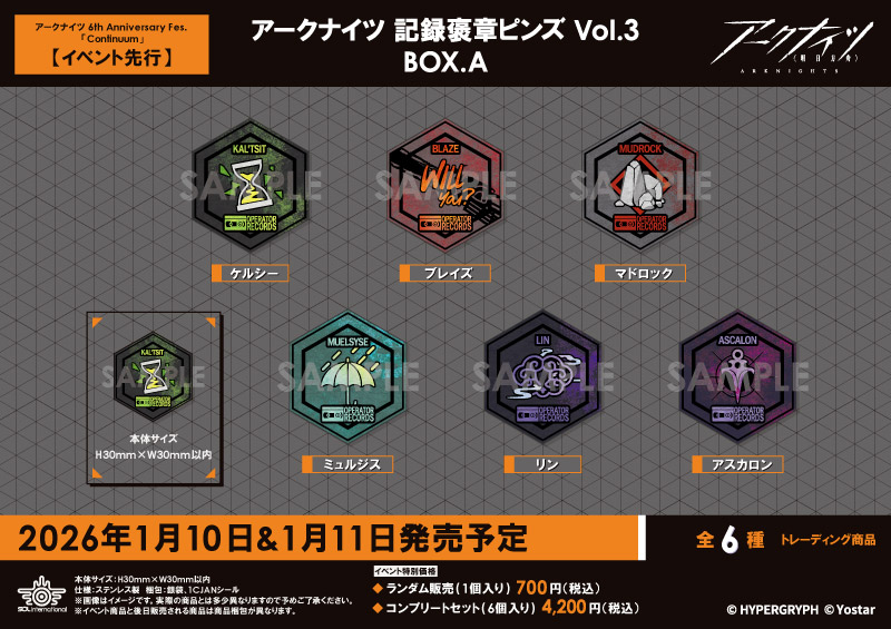 アークナイツ6周年リアルイベント『アークナイツ 6th Anniversary Fes. 「Continuum」』にて先行販売を予定しております。